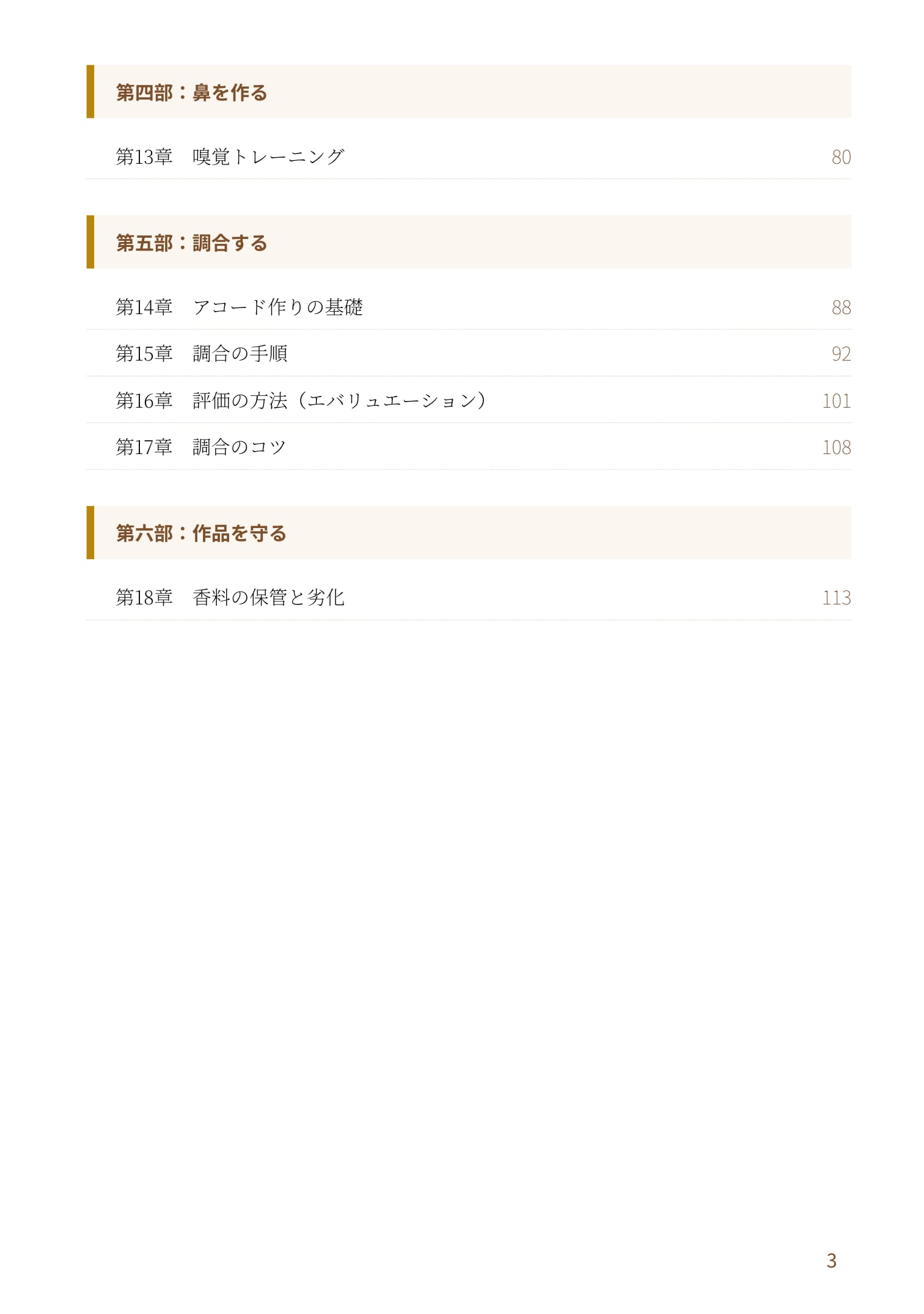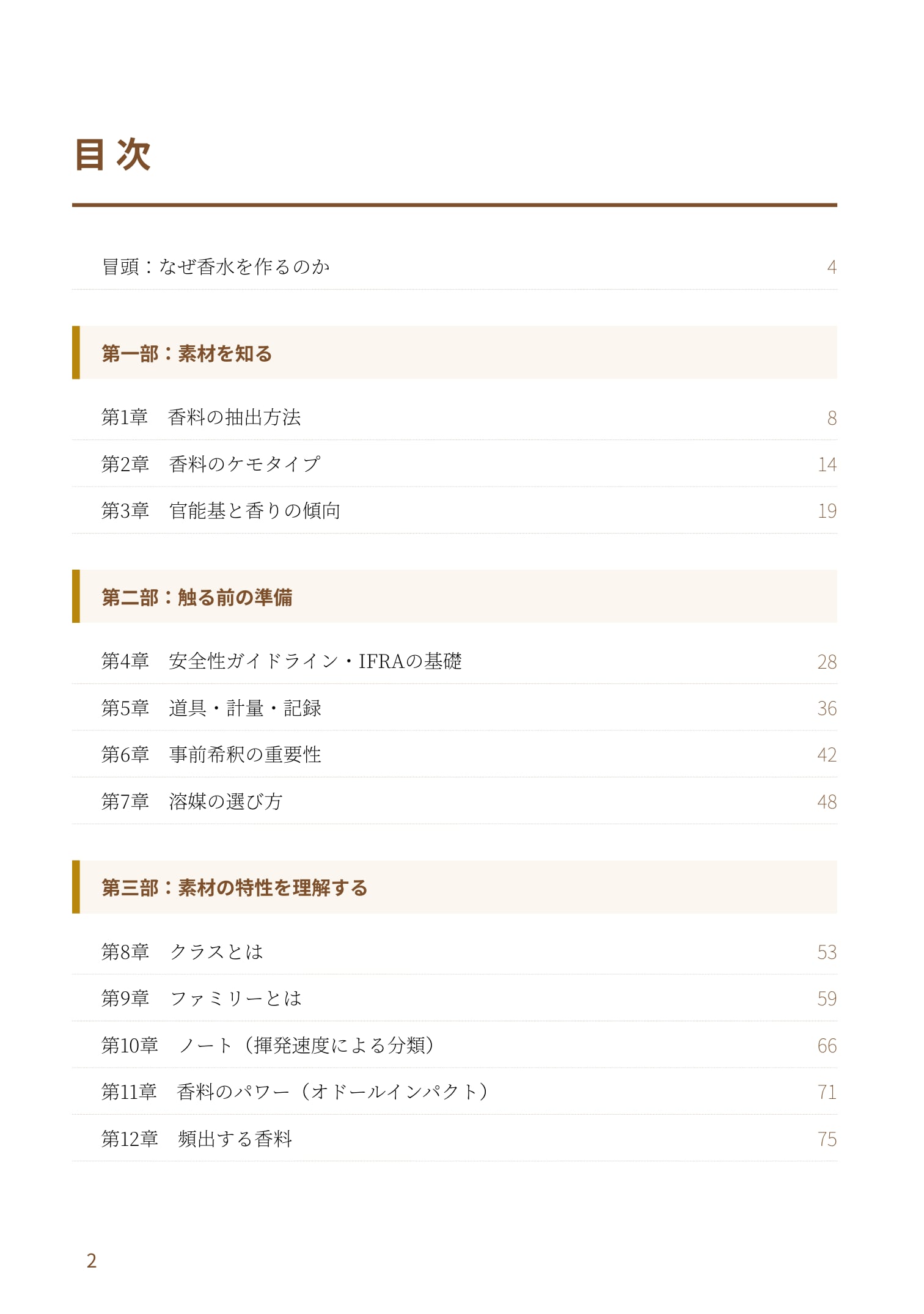本書は全18章・6部構成で、素材の正体を知るところからスタートし、安全な取り扱い、素材の体系的な理解、そして実際の調合・評価・修正までを段階的に積み上げていきます。