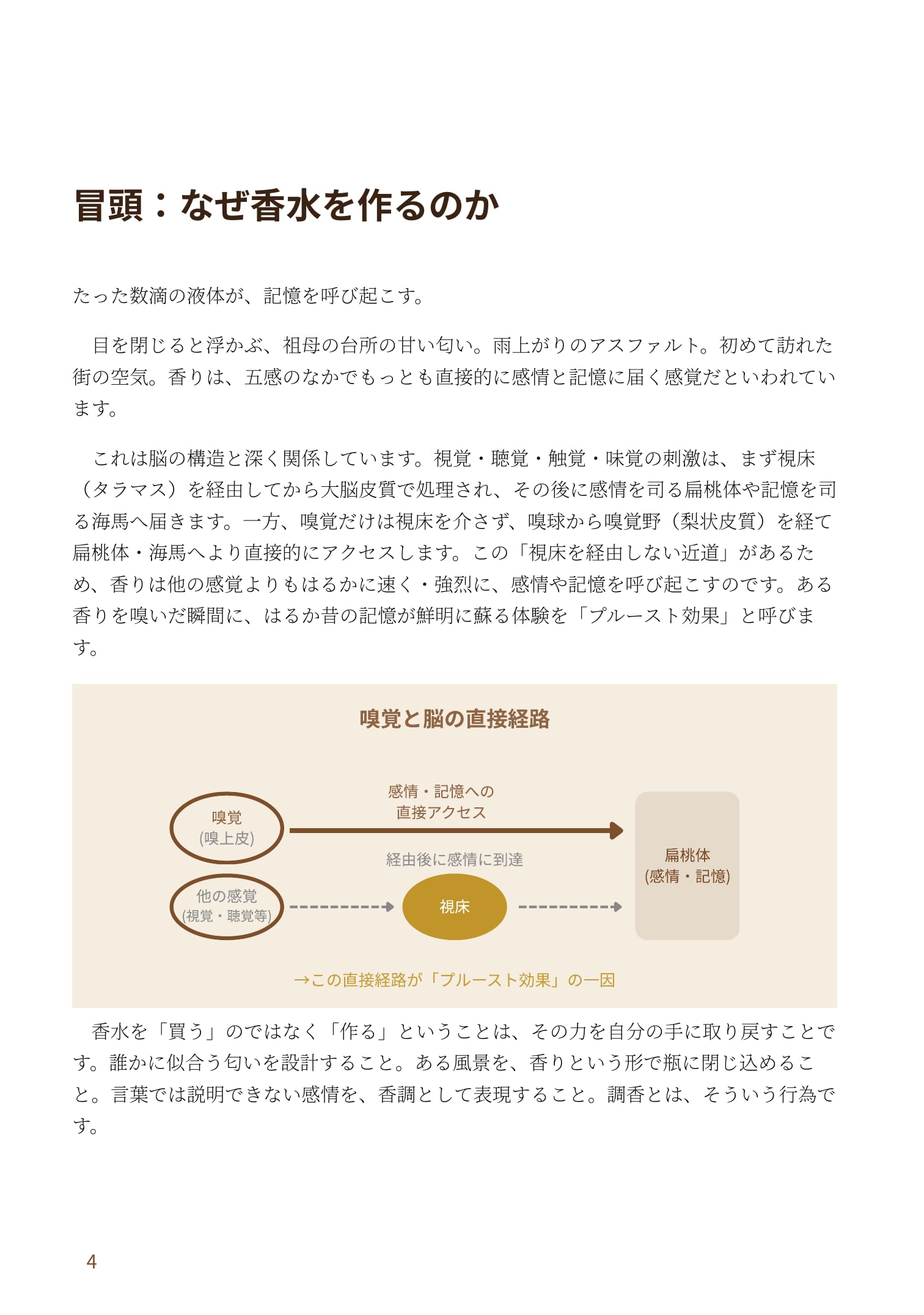 調香を始めたいすべての人のための独立した教科書です。香りの知識がゼロでも、化学が苦手でも問題ありません。必要なのは、鼻と、好奇心と、少しの道具だけ。